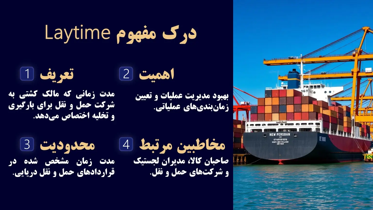 | مدیریت کارآمد زمان و کاهش تأخیرها | لی تایم مدت زمانی برای عملیات بارگیری و تخلیه است که به کاهش تأخیرها و هزینههای اضافی کمک میکند. |