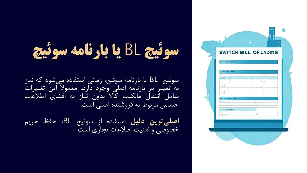 سوئیچ BL یا بارنامه سوئیچ، زمانی استفاده میشود که نیاز به تغییر در بارنامه اصلی وجود دارد. معمولاً این تغییرات شامل انتقال مالکیت کالا بدون نیاز به افشای اطلاعات حساس مربوط به فروشنده اصلی است.