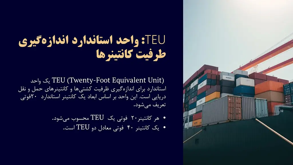 | تعریف TEU | TEU یک ابزار کلیدی در استانداردسازی صنعت حمل و نقل دریایی است. |