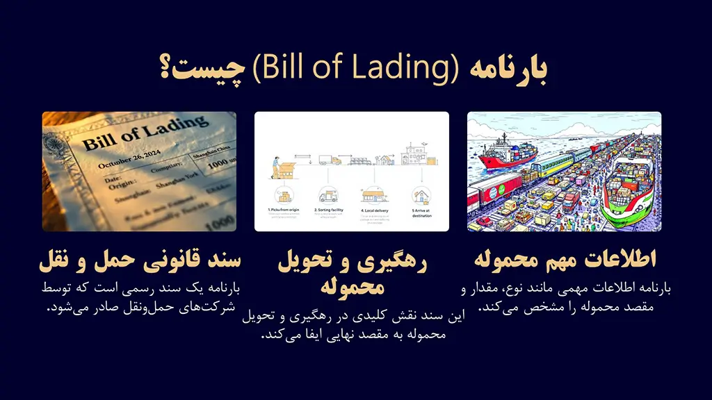 بارنامه (Bill of Lading)، سندی قانونی است که توسط شرکت حمل و نقل برای فرستنده صادر میشود. این سند اطلاعات مربوط به بار، مانند نوع، مقدار و مقصد آن را مشخص میکند.